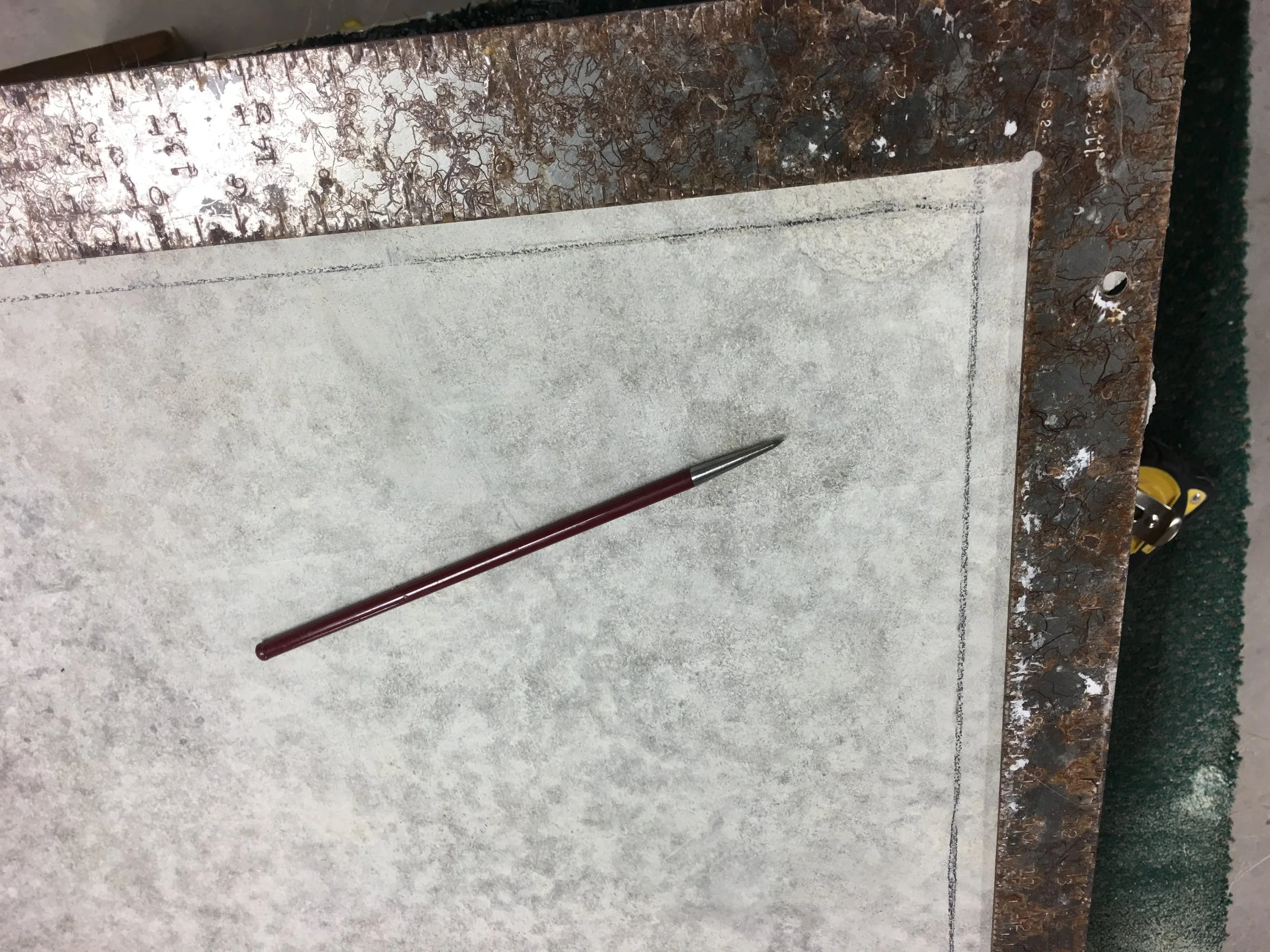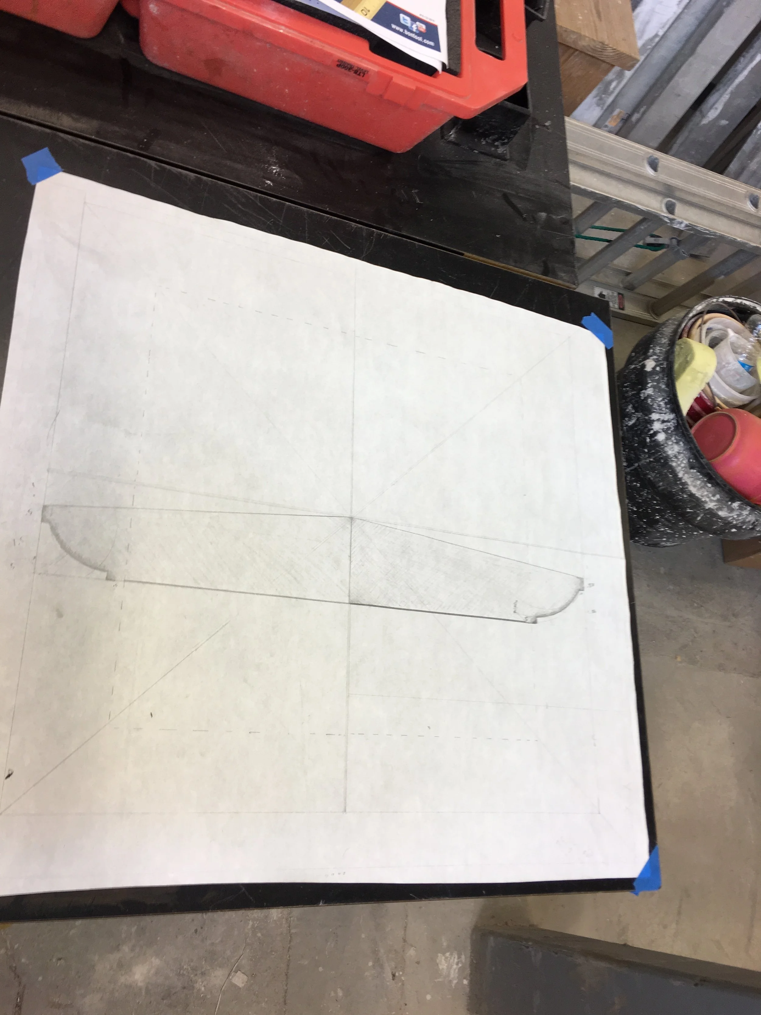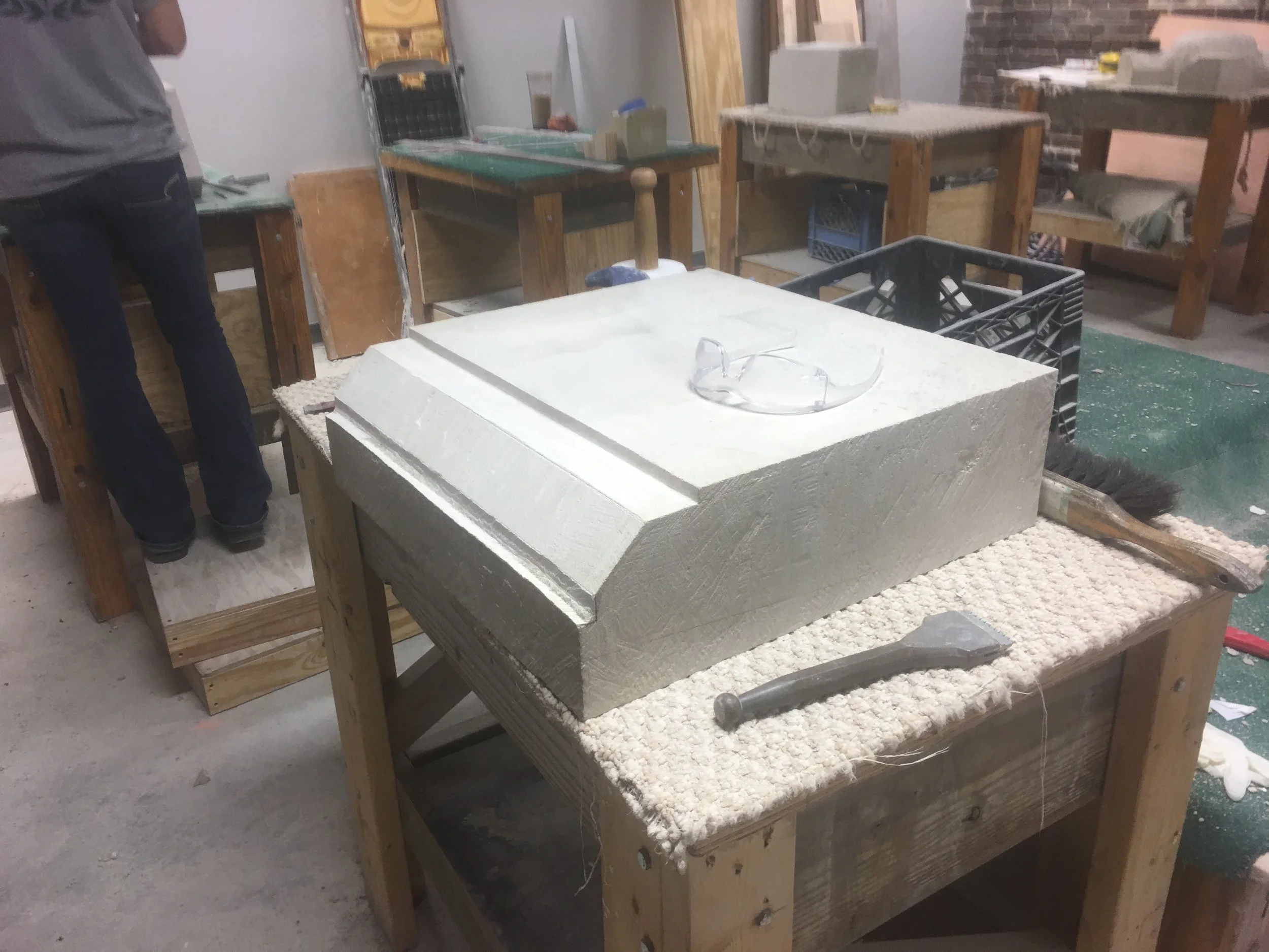 Our first step is to create a template, which depicts the final shape of the stone. Our stone will be split in to 4 divisions, each student working on a single part. After the template is created we set out and score the lines on the rough block.