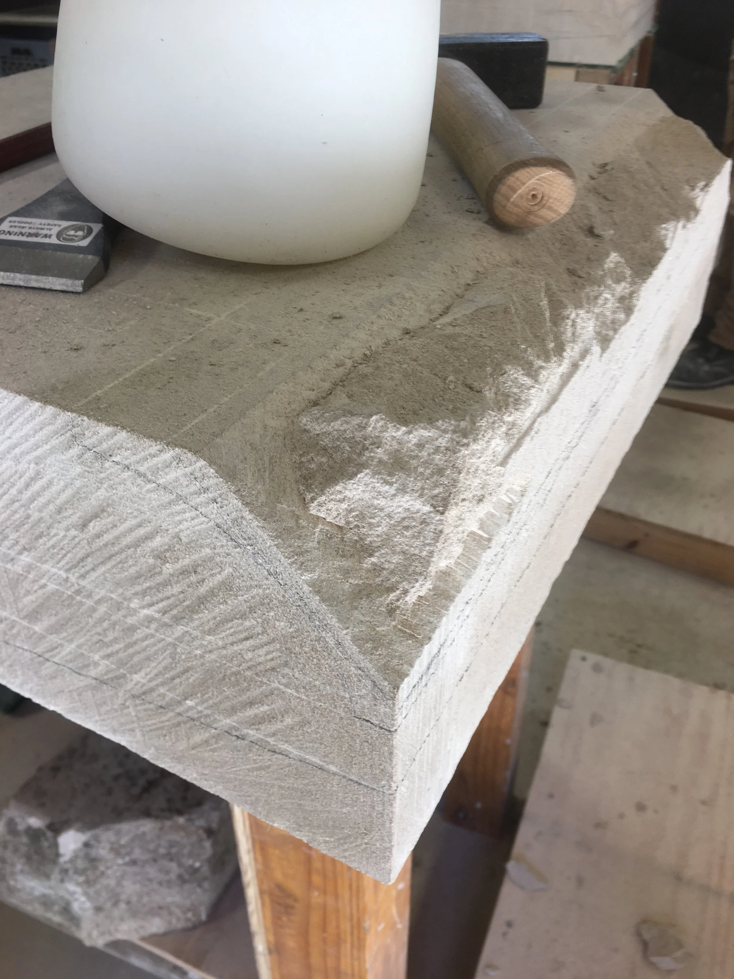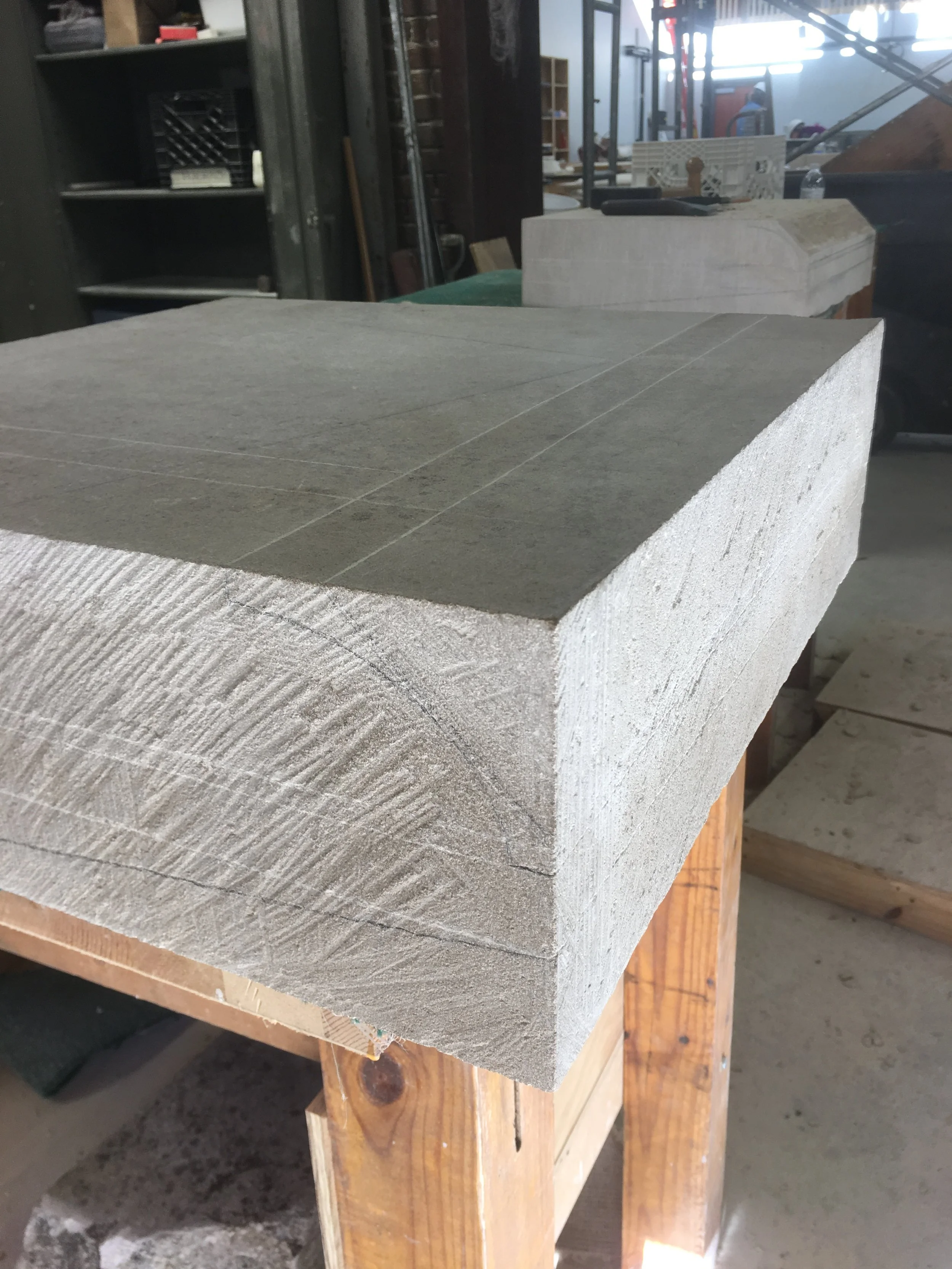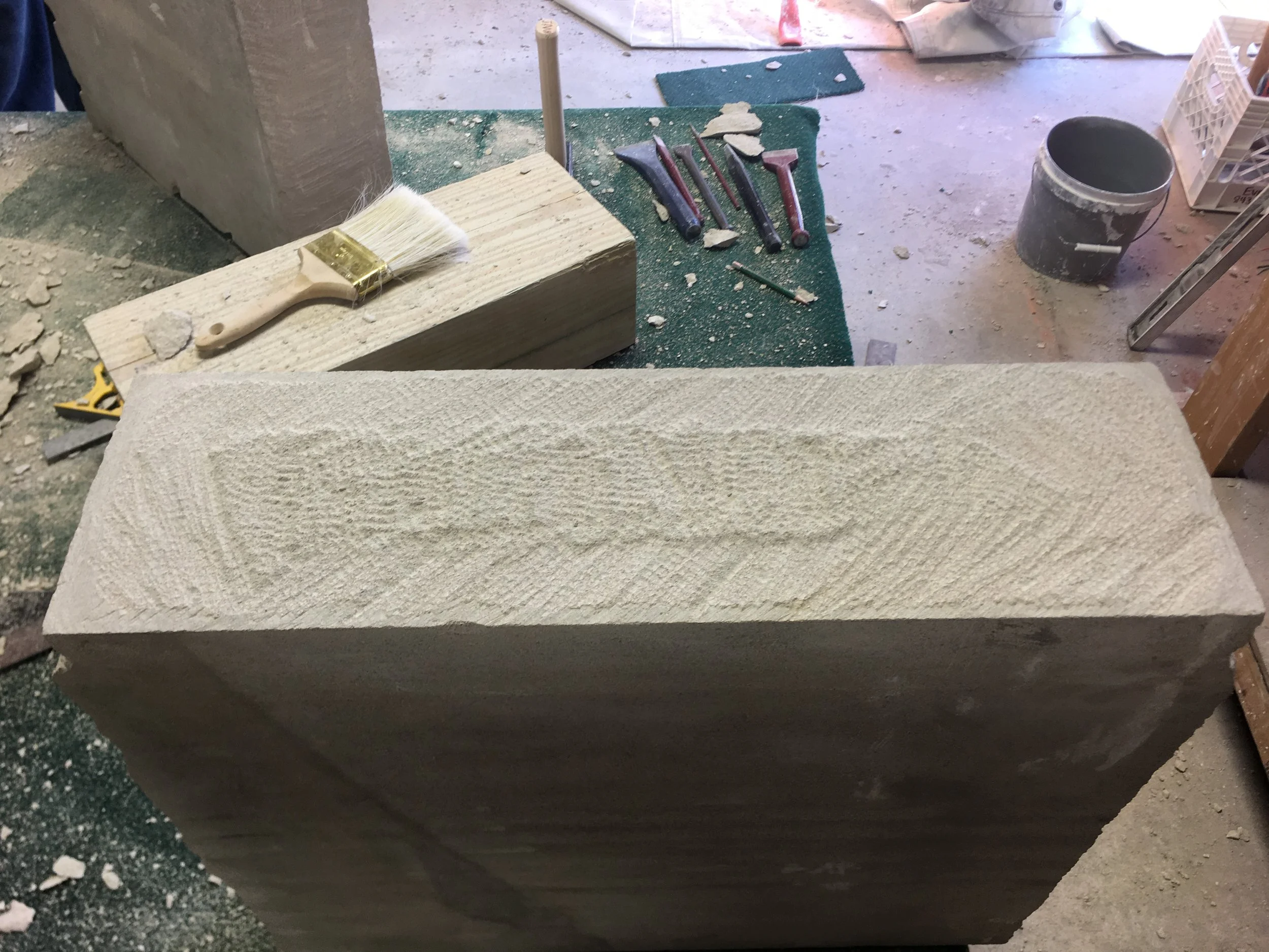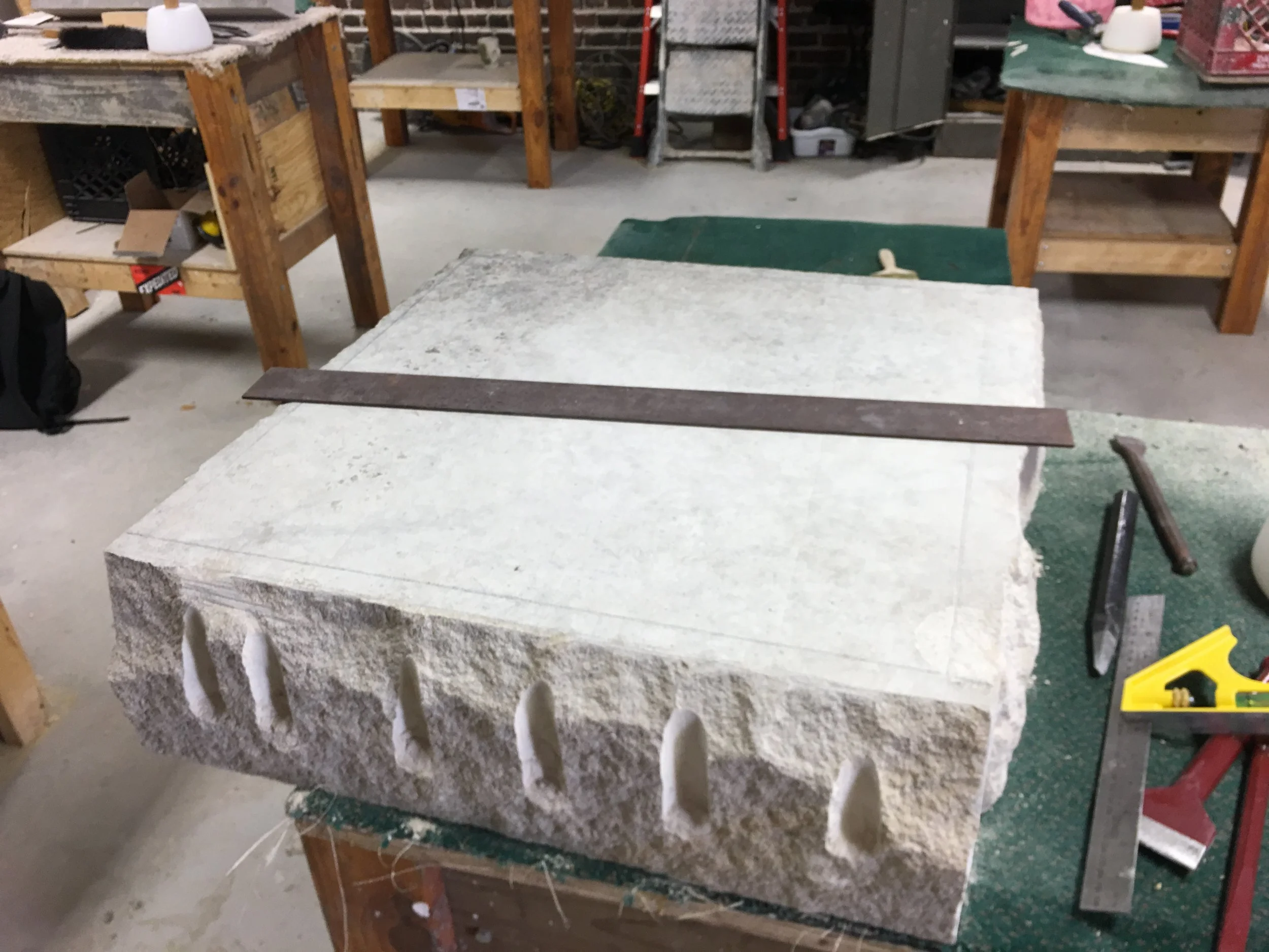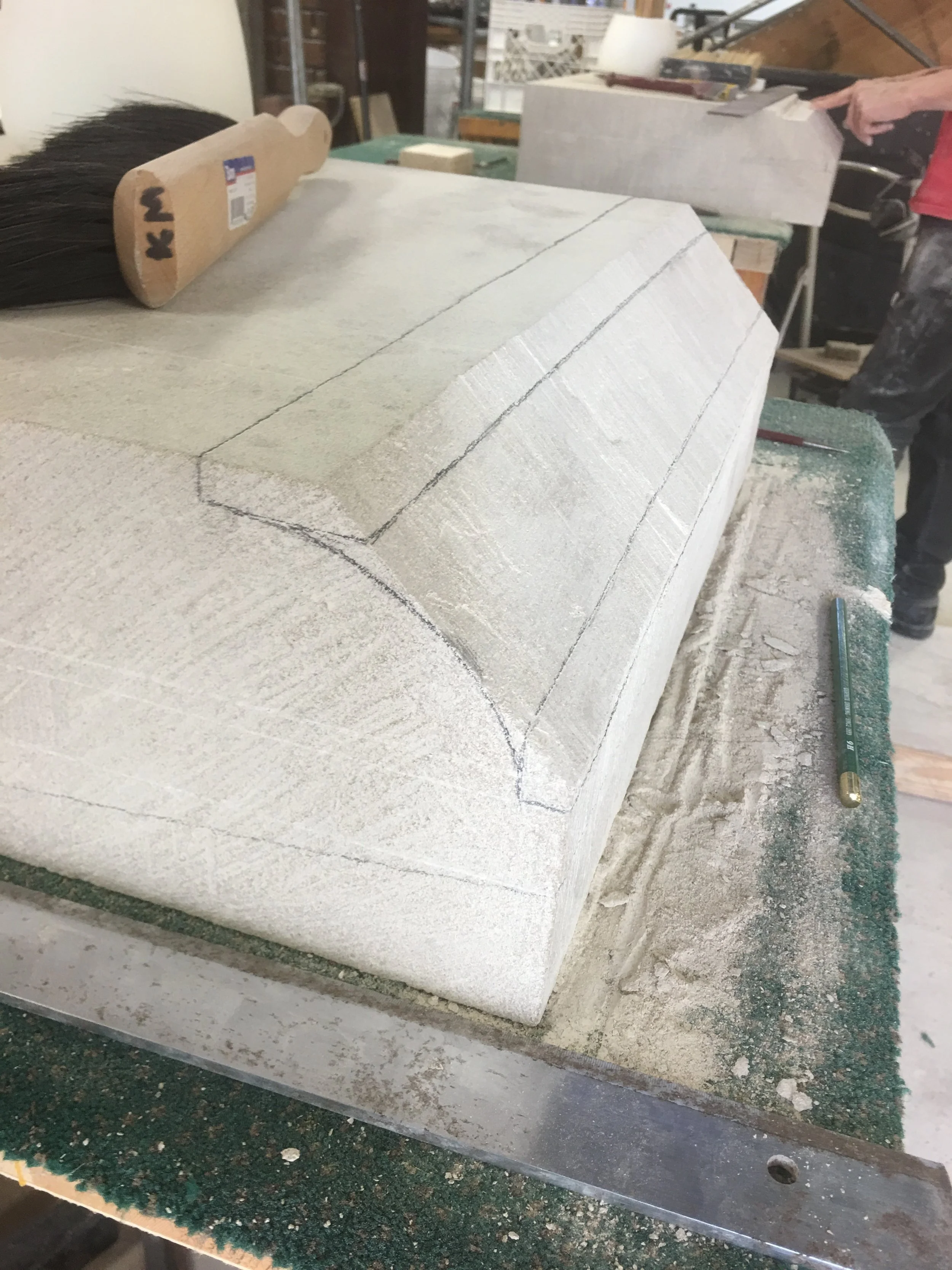 Once the lines are laid out, the stone is worked back. Special care is taken to carve the stone at 45 degree angles to all corners to prevent the limestone from blowing out. the center is then worked down gradually, as trying to remove too much stone at one time is liable to create fractures.